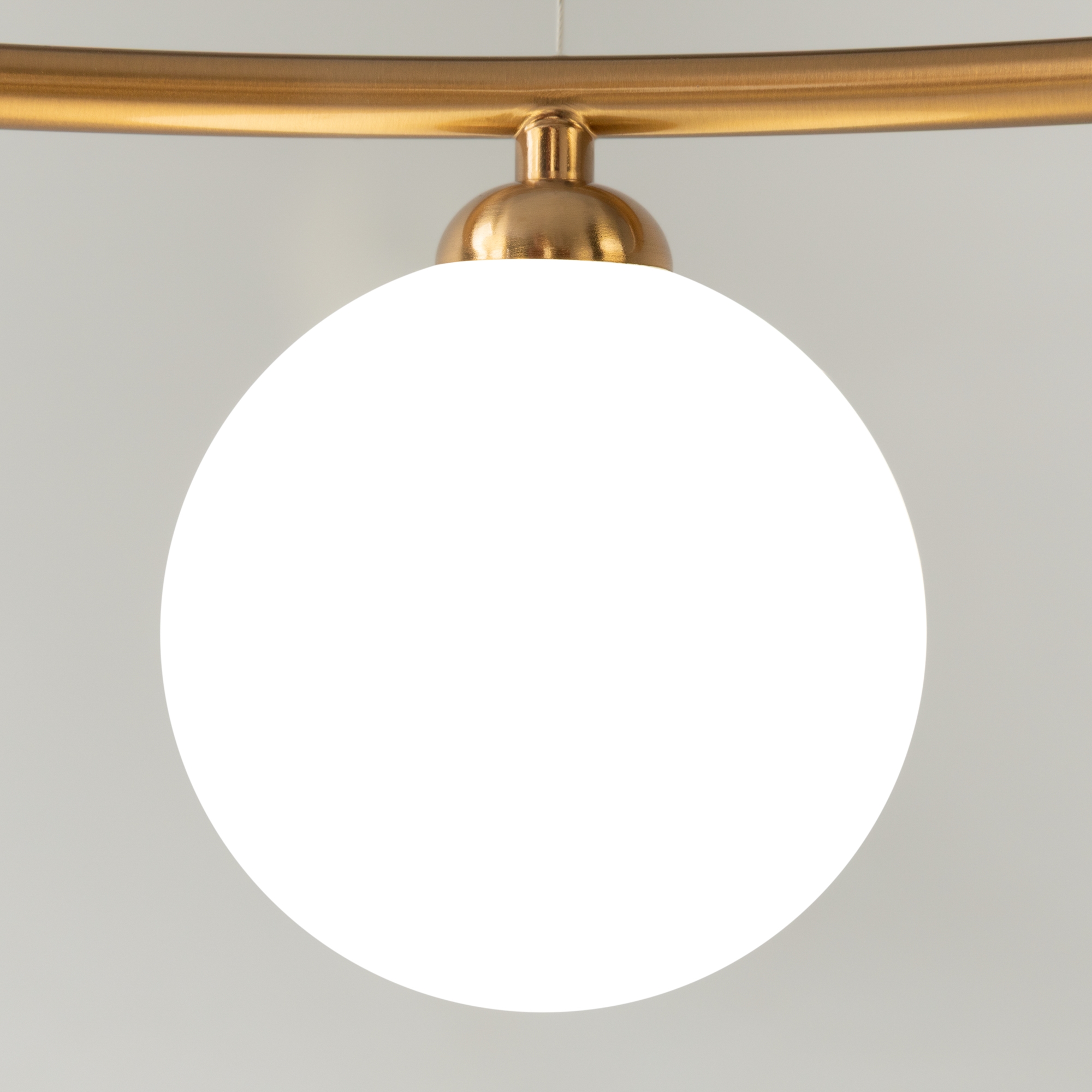Арматура из металла в трех оттенках: белый, черный, латунь. Плафоны-сферы закреплены на округлом металлическом каркасе. Материал плафонов — выдувное стекло, цвет — белый. Высота подвесных моделей регулируется.