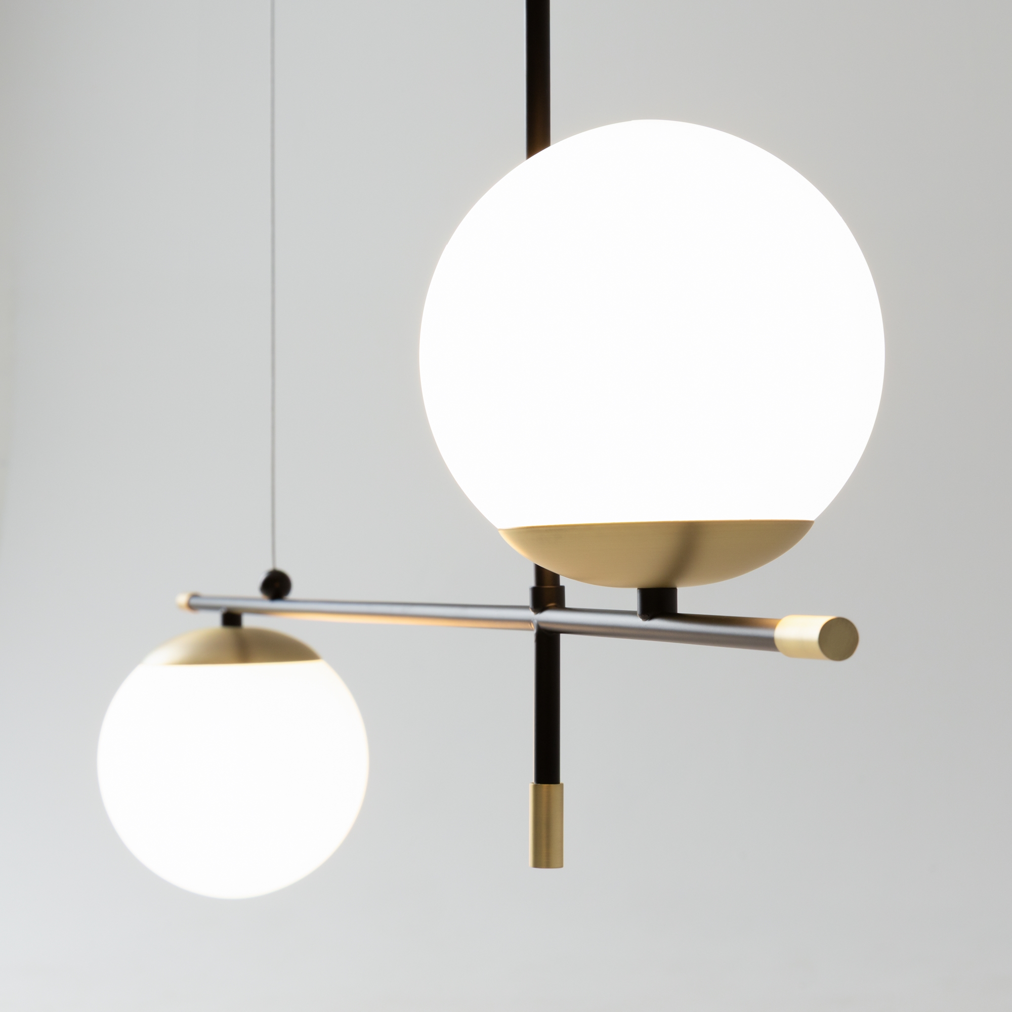 Арматура из металла в цвете матового золота. Плафоны-сферы из матового выдувного стекла. Модная асимметрия в дизайне. Источник света — лампы с цоколем Е14.