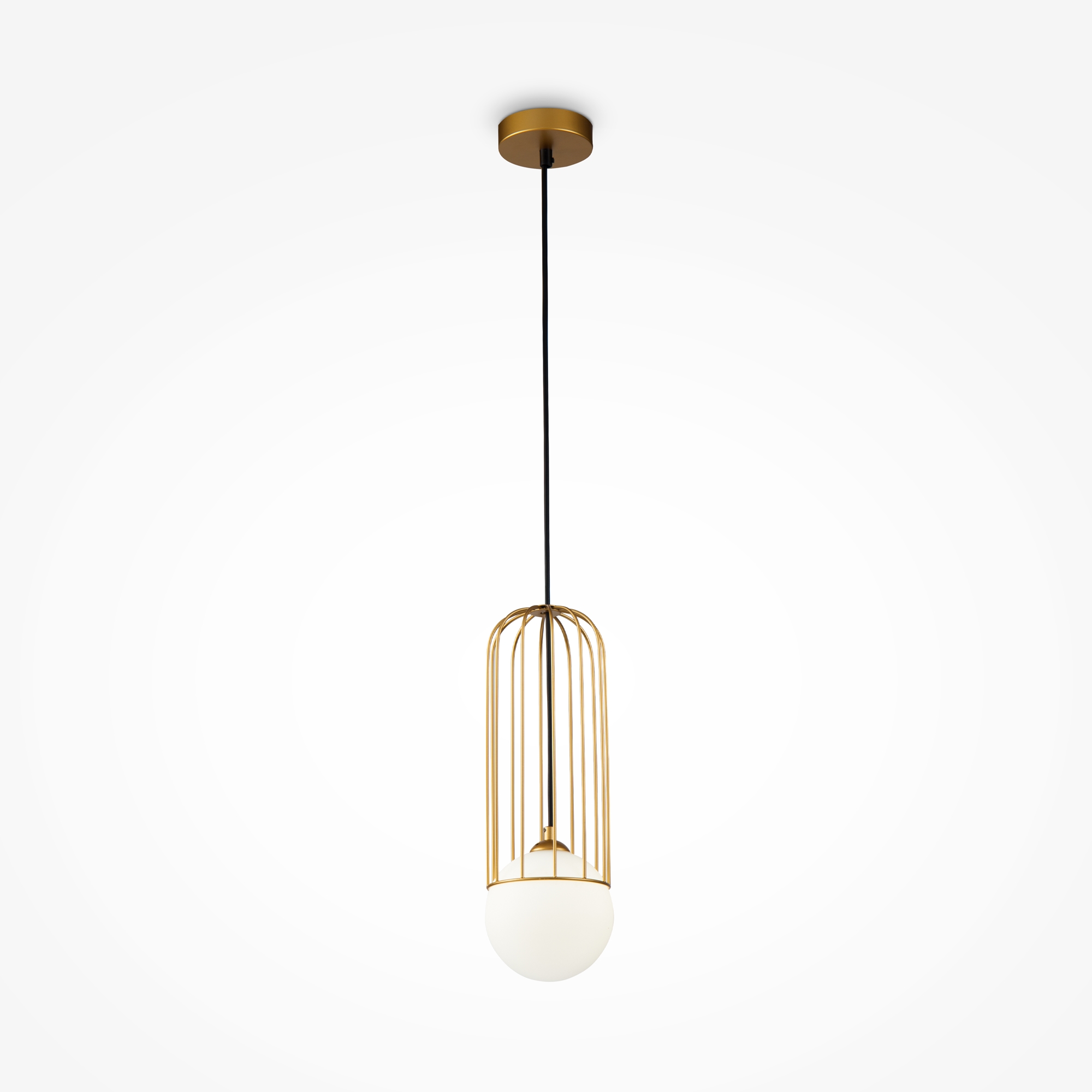 Арматура из металла в золотом цвете. Плафон из матового белого стекла. Декор плафона Telford — решетка из стальной проволоки в тон арматуре. Регулируемая высота.