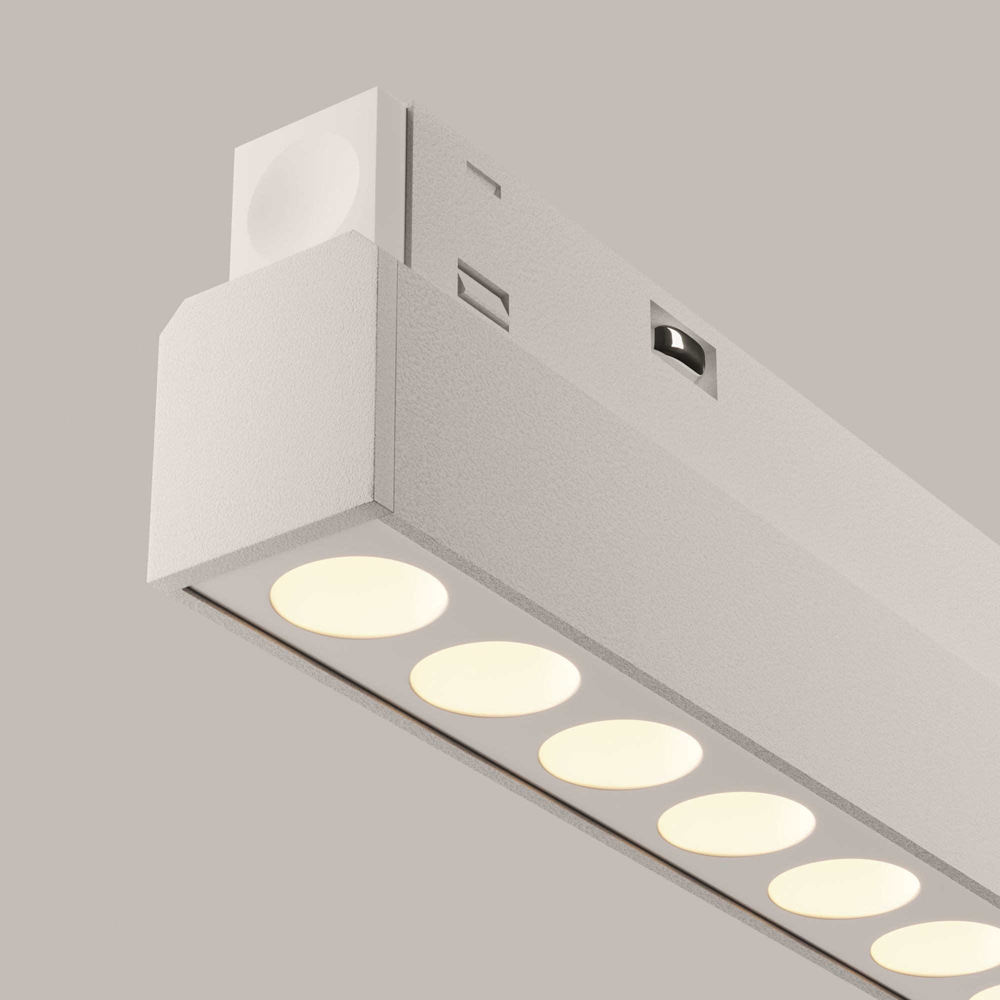 Алюминиевый корпус в черном и белом цветах.  Три размера – три варианта мощности. LED-источник света. Скрытый источник света - уникальный оптический эффект света из ниоткуда. Угол рассеивания — 36°. Цветовая температура 3000К и 4000К, а также умные модели с регулируемым диапазоном от 3000К до 6000К и диммированием по протоколу Bluetooth Mesh. Это позволяет управлять группой или отдельным светильником: вкл/выкл, диммировать, изменять цветовую температуру. Также доступно беспроводное управление светом со смартфона, пульта, с помощью голосовых помощников."